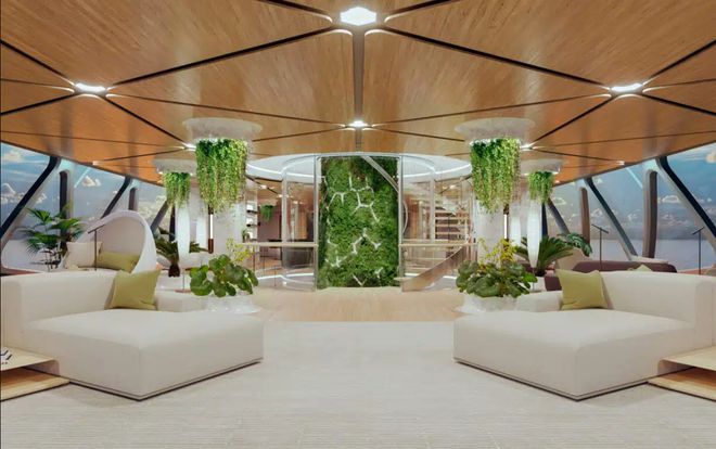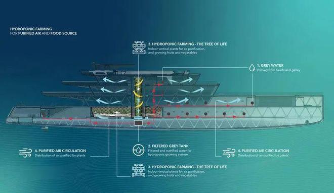 室内设计的核心是多层次的“生命之树”——一个活生生的自然界纪念碑,以及提供新鲜食物和空气净化的水培花园的核心。树的底部从下层甲板的倒影池中露出来,周围环绕着水培和冥想的“禅园”。这棵树垂直延伸穿过所有四个层次,并伴随着一个雕塑般的螺旋楼梯。