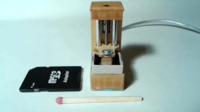 从演示视频来看,这台微型 3D 打印机似乎是由木材和塑料组合而成,底部装有一个电机,可以上下移动定位板,然后用一个看不见的 LED 原件将光线印在一个小槽中的树脂材料上。